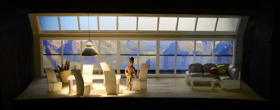 I solved the story in contemporary key, since the issue is also current nowadays. I tried to pick the costumes, which would fit in our street-style that would be congenial with each person and correspond to their character. In design, I was inspired and awed by the picture of Norwegian mountains and fiords, which was already written in the play. On the stage, I depict a Nordic-style light and airy modern living room with windows covering the whole back wall from floor to the ceiling and sliding doors leading to the terrace. In space design, I use single large pieces of furniture, light wooden floor and drying houseplants. The windows open a view downhill to the fiord and the mountain peaks in the horizon. For the view, I used a back-projection summer photo of Norwegian mountains and a fiord in the middle of the mountains, to create an illusion to the viewer as if they were in the Allmers house in the middle of the relationship turmoil.