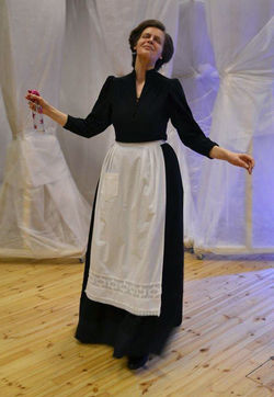 In costume design, I decided to use mostly black and white colours, stressing the contrast between the governess who arrives at the house and the inhabitants of the house. The governess is the only character in the play whose appearance I decided to solve in warm tones, using pastel beige, pinkish and plum colours. The costumes of the ghosts were black in every sense, because those characters as if arose from the dead. As a part of her dress, Miss Jessel carried along a lake at which she was often seen and Quint with his jacket covered in moss, dirt, trash and spider nets was as if he just climbed out from the soil next to the moat. Some colour spots were added to them only by the flicker of the lake water and some details from the jacket. In the first act, the children looked like paper dolls, all clothed in snow-white, clean, diligent and pink-cheeked. In the second act, where the ghosts had clawed them into their power, the elements imitating spider webs were added to the children’s clothes and their make-up also got scarier. Mrs Grose as the children’s caretaker stood between these two worlds and was clad in black and white suitably to her profession. I thought that this colour game suited well with the warm wood of the chamber hall and the white airy fabric used in the design of the play. The clothing styles somewhat hinted at the mid-19th century, but at the wish of the director, their era could not be directly defined. I tried to create the clothing of the children in a way that they could be easily turned into neat daily clothes as well as night clothes and I believe I was successful.