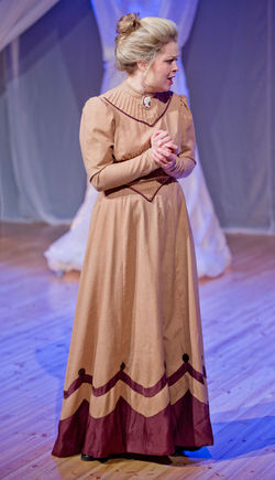 Kostüümikujunduses otsustasin kasutada põhiliselt must-valget koloriiti, rõhutades kontrasti elamisse saabunud guvernandi ning majaelanike vahel. Guvernandi välimuse lahendasin ainsa tegelasena soojades toonides, kasutades pastelseid beeže, roosakaid ja ploomikarva toone. Kummituste kostüümid tegin üleni mustad, igas mõttes, kuna tegemist oli justkui surnust üles tõusnud tegelastega. Miss Jessel kandis enda kleidi osana kaasas järve, mille ääres teda sageli nähti ning Quint oli oma sambla, pori, risu ja ämblikuvõrkudega kaetud pintsakuga otse kraavipervelt maa seest välja roninud. Veidi värvilaike lisasid neile vaid järvevee sillerdus ja detailid pintsakult. Lapsed olid esimeses vaatuses kui pabernukud, üleni lumivalgesse riietatud, puhtad, viisakad ja roosapõsksed. Teises vaatuses, kui vaimud olid nad enda võimusesse haaranud, lisandusid ka laste kostüümidele ämblikuvõrku imiteerivad elemendid ning ka grimm muutus hirmuäratavamaks. Mrs Grose laste hooldajana seisis nende kahe maailma keskel ning oli ka oma ametile sobivalt riietatud must-valgesse. Leidsin, et taoline koloriidimäng sobib hästi kammersaali poolt pakutava sooja puidu ning lavastuse kujunduses kasutatava valge õhulise kangaga. Rõivastiilid vihjasid mõneti 19. sajandi keskpaigale, kuid jäid lavastaja soovil täpselt ajastusse määratlematuks. Laste kostüümid püüdsin teha sellised, et samad rõivad oleksid lihtsalt muudetavad nii korralikeks igapäevariieteks kui ka ööriieteks ning usun, et see õnnestus.