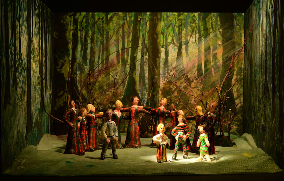 Upon creating this design, I was inspired by the knittings of young fashion designer Kristel Kuslapuu and several choir concerts. I concentrated on the costumes and used choir in the creation of the stage design (I handled the piece as a musical play), which created suitable design elements when moving as a mass in harmony with the costumes. The world reigned by the nature where people try to impose their own rules is conveyed by the projections of the painted forest on three walls and the airy floor covering lit from the edges.
